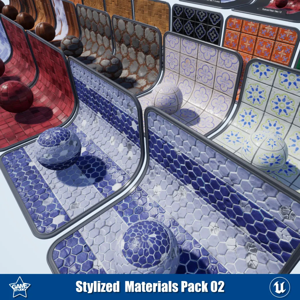 This stylized materials pack includes 26 PBR materials for Unreal Engine and Unity, perfect for creating stylized 3D environments. The pack contains versatile flooring with wood, tile, and Portuguese tile materials to build floors. It also includes 5 desert tile materials for creating desert environments. The wood floor materials feature vertex painting channels, allowing you to paint snow, sand, or dirt effects. With this pack, you can quickly design eye-catching stylized scenes with customized ground textures. The materials are optimized for game engines and 3D projects requiring a hand-painted aesthetic.